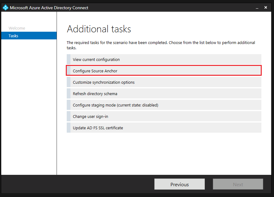 Open the AAD Connect tool > Go to Tasks > Configure Source Anchor