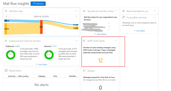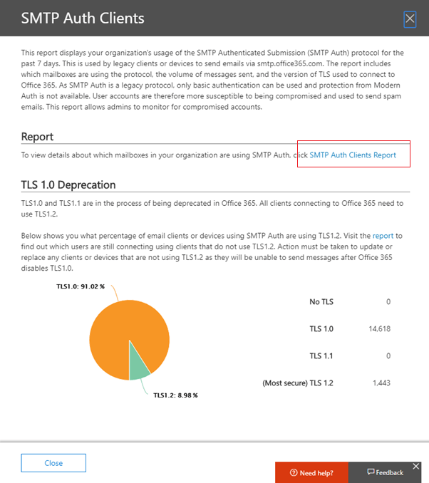 - To download the report go to https://protection.office.com -> Mail Flow -> Dashboard- for SMTP Auth Clients Report