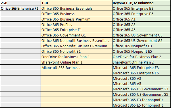 ODB works with a variety of Office 365 licenses and depending on the license type, the storage quotas varies.