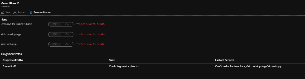 1. State – Conflicting Service Plans – This means one or many features in once license is already available in another assigned license
