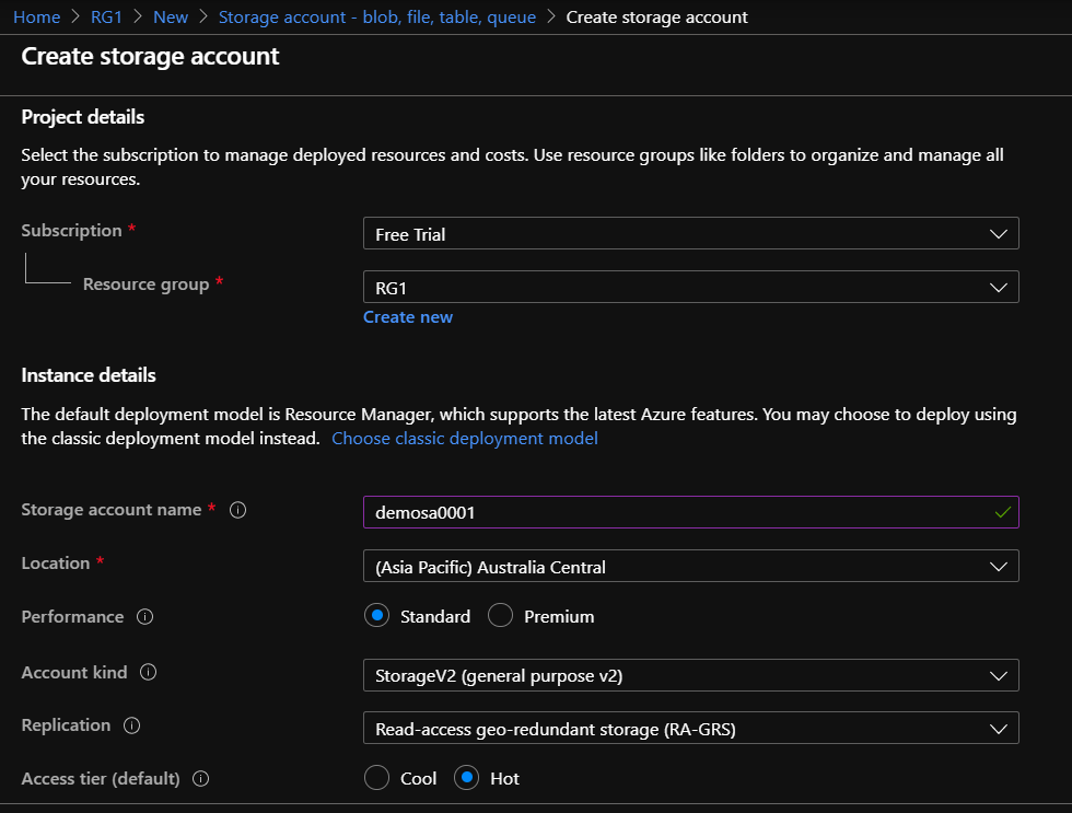 • Select the location, performance, Account Kind, Replication Type and access tier