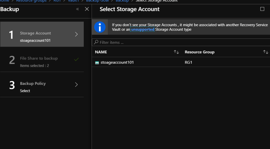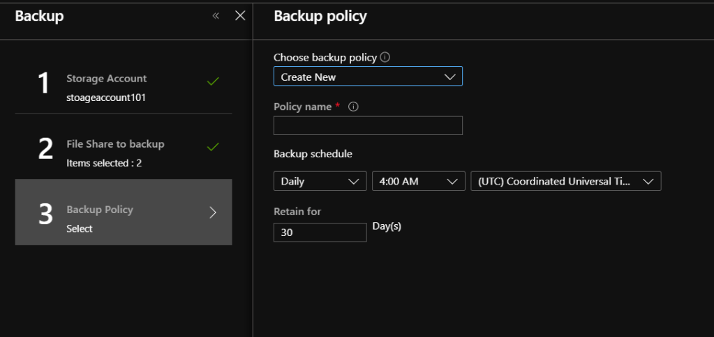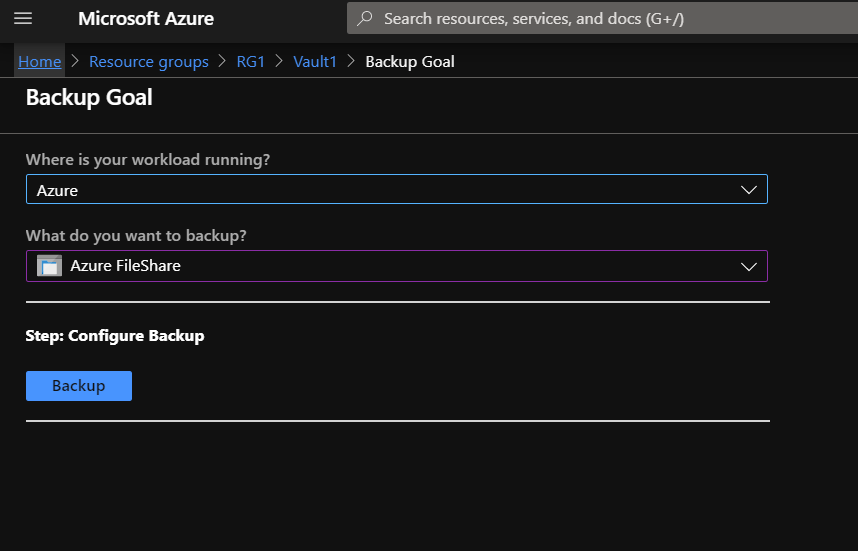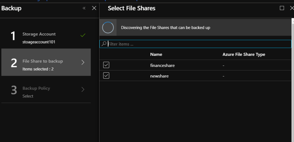 • Select What you need to backup. In this case “Azure FileShare”