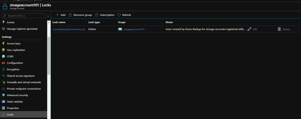 Note – A lock in the Storage Account will be created for the backups after you setup backups. This is to protect the file deletions.