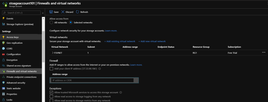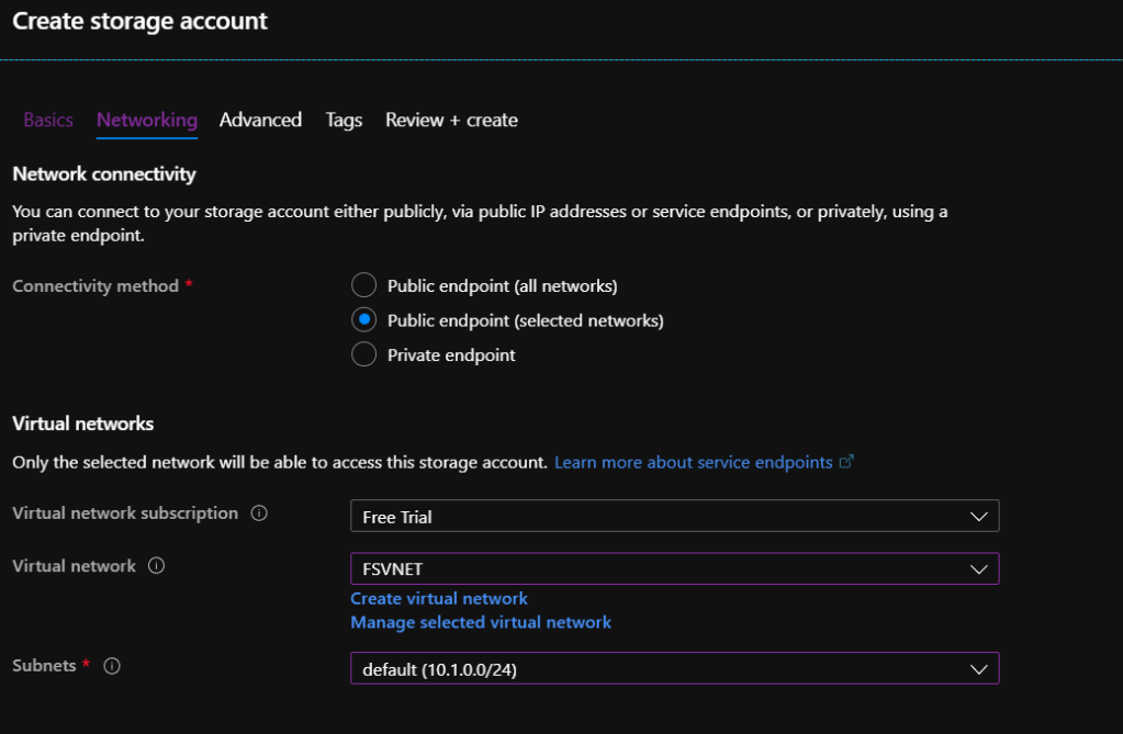 • Next page will be Networking. Select the options according to your requirement. This will limit access to the Storage Account from selected networks only. This can be setup later as well.