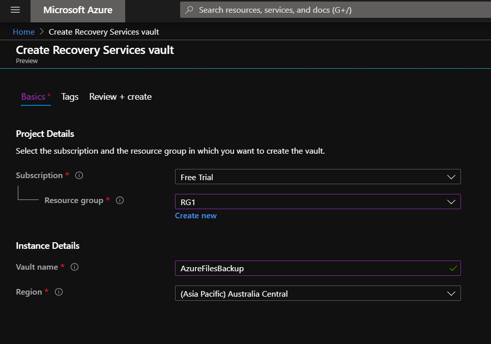 • Create the Recovery Services Vault in the same previous Resource Group