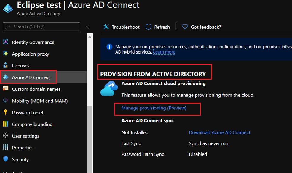 - Open Azure AD Portal and navigate to Azure Active Directory > Azure AD Connect