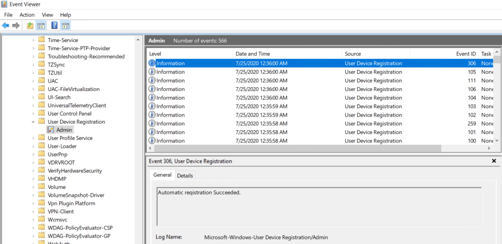 Navigate to Applications and Service Logs > Microsoft > Windows > User Device Registration > Admin