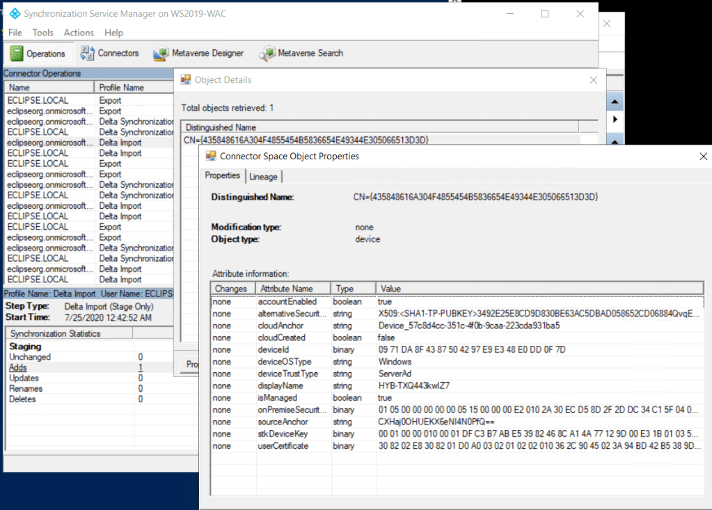 If you now check the Synchronization Service Manager, you can notice the Add and if you dig further, you’ll be able to see the computer device and the certificate thumbprint in the userCertificate as well