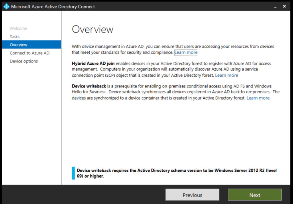 Open Azure AD Connect and navigate to Configure Device Options