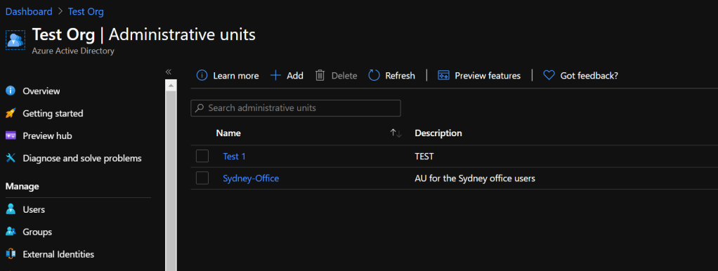 The Administrative Units or AUs are similar to the above concept. Azure AD doesn’t have OUs and the objects are not manageable as the traditional AD. Hence the AUs and Roles.