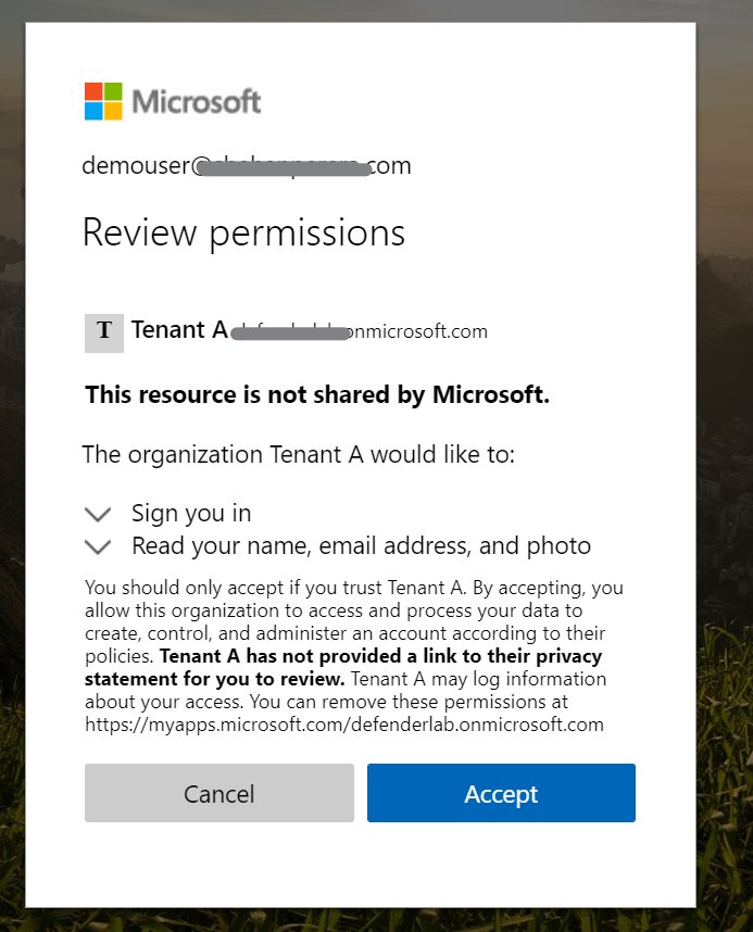 Demo user will receive the Consent Accept/ Decline option when they trying to access the Tenant A resources and that completed the user creation flow