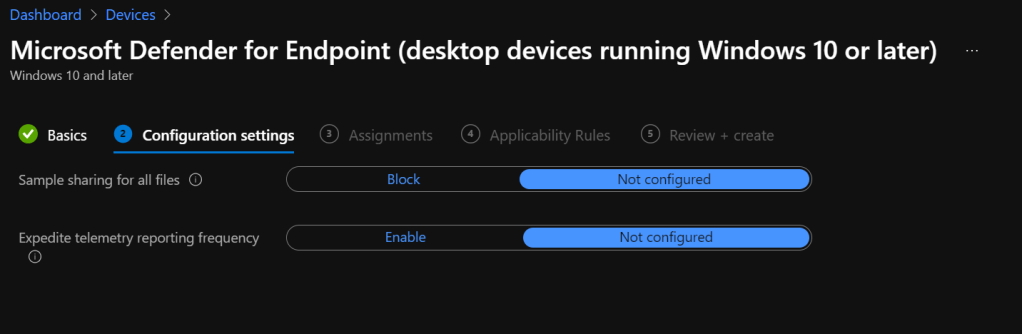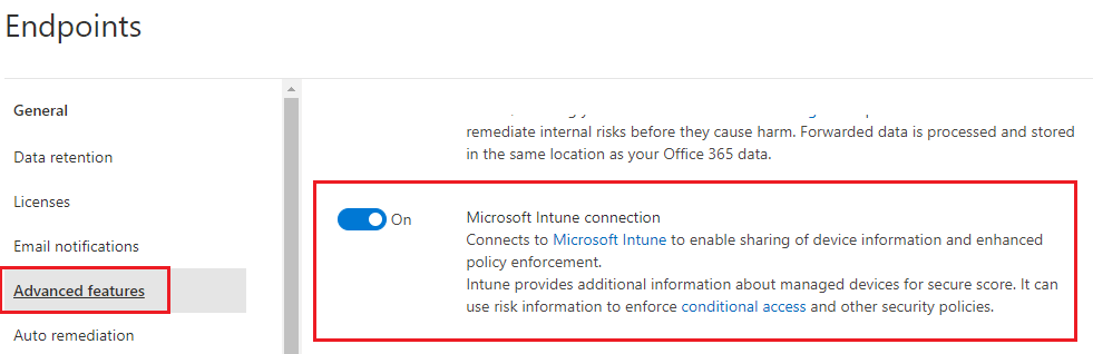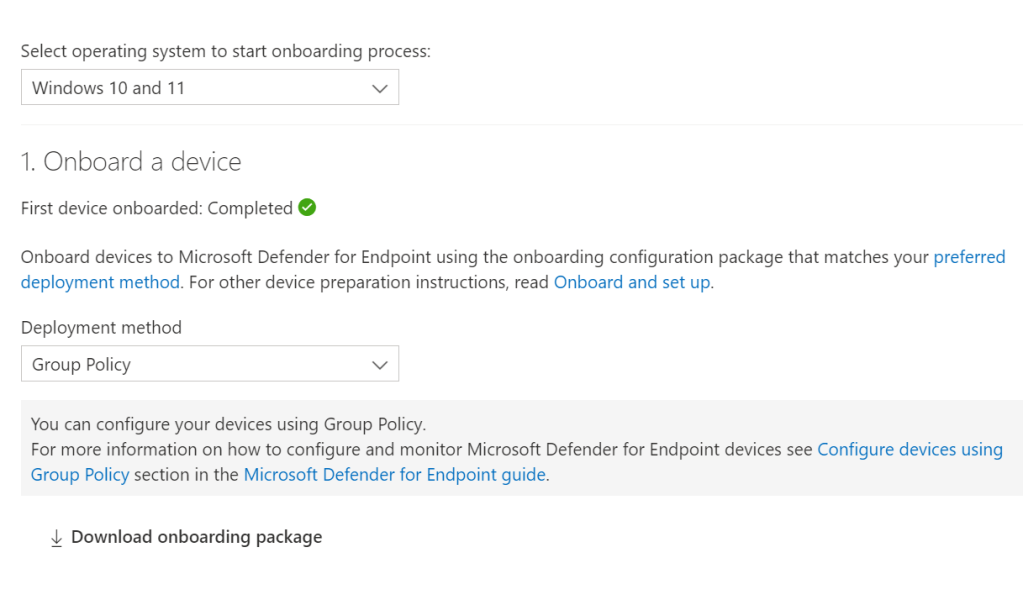 According to Microsoft – The preceding screen capture shows your configuration options after you’ve configured a connection between Intune and Microsoft Defender for Endpoint. When connected, the details for the onboarding and offboarding blobs are automatically generated and transferred to Intune.