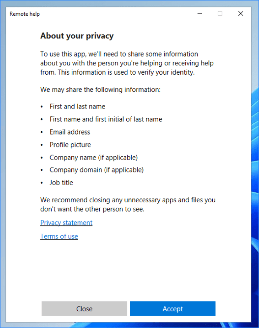 1. Now Sharer to open the Remote Help app and accept the legal notes for the 1st time use