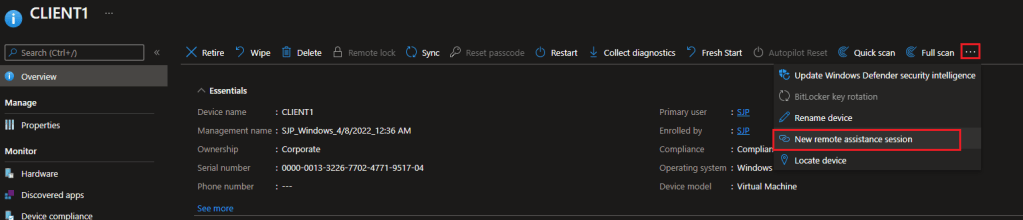 1. IT admin to go to the Intune portal > Devices > Windows > Select the device to support > click on the 3 dots . . . and select New remote assistance session