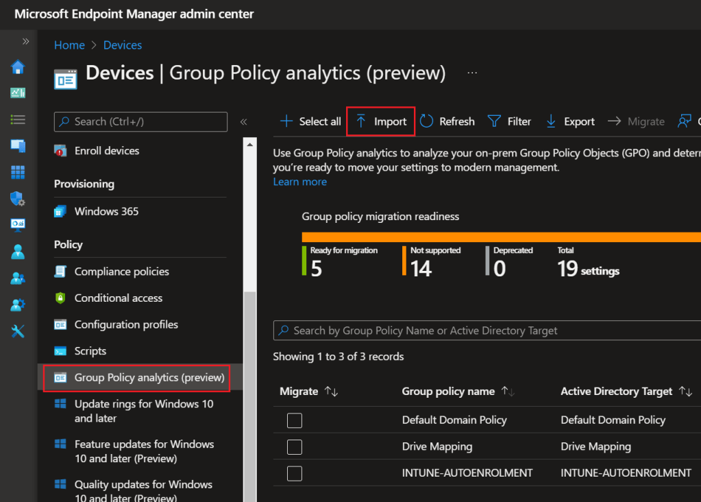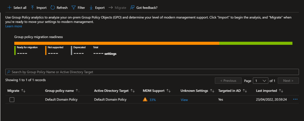 The good thing about Group Policy Analytics feature is that if the GPOs are supported by MEM, it will help you to migrate them to MEM it self in few clicks.