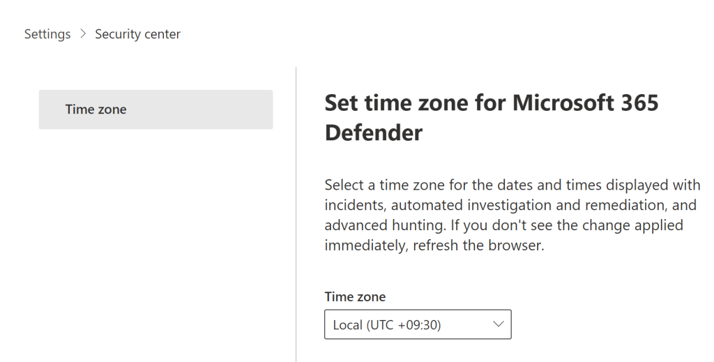 Go to Security Portal on https://security.microsoft.com > Settings > Security Center >Set the time zone
