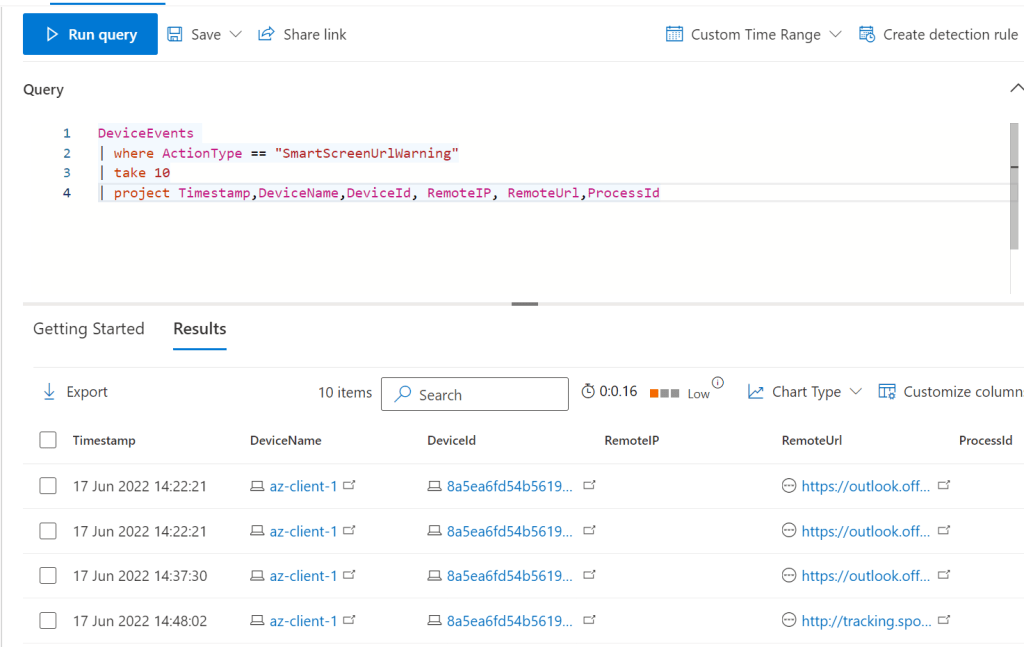 DeviceEvents | where ActionType == "SmartScreenUrlWarning"