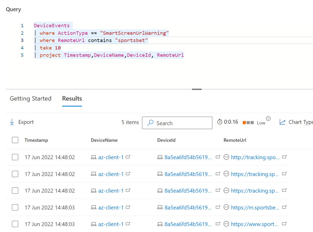 Below query look for Smart Screen URL Warnings, but specifically for URLs that contains the word sportsbet as that a gambling site.