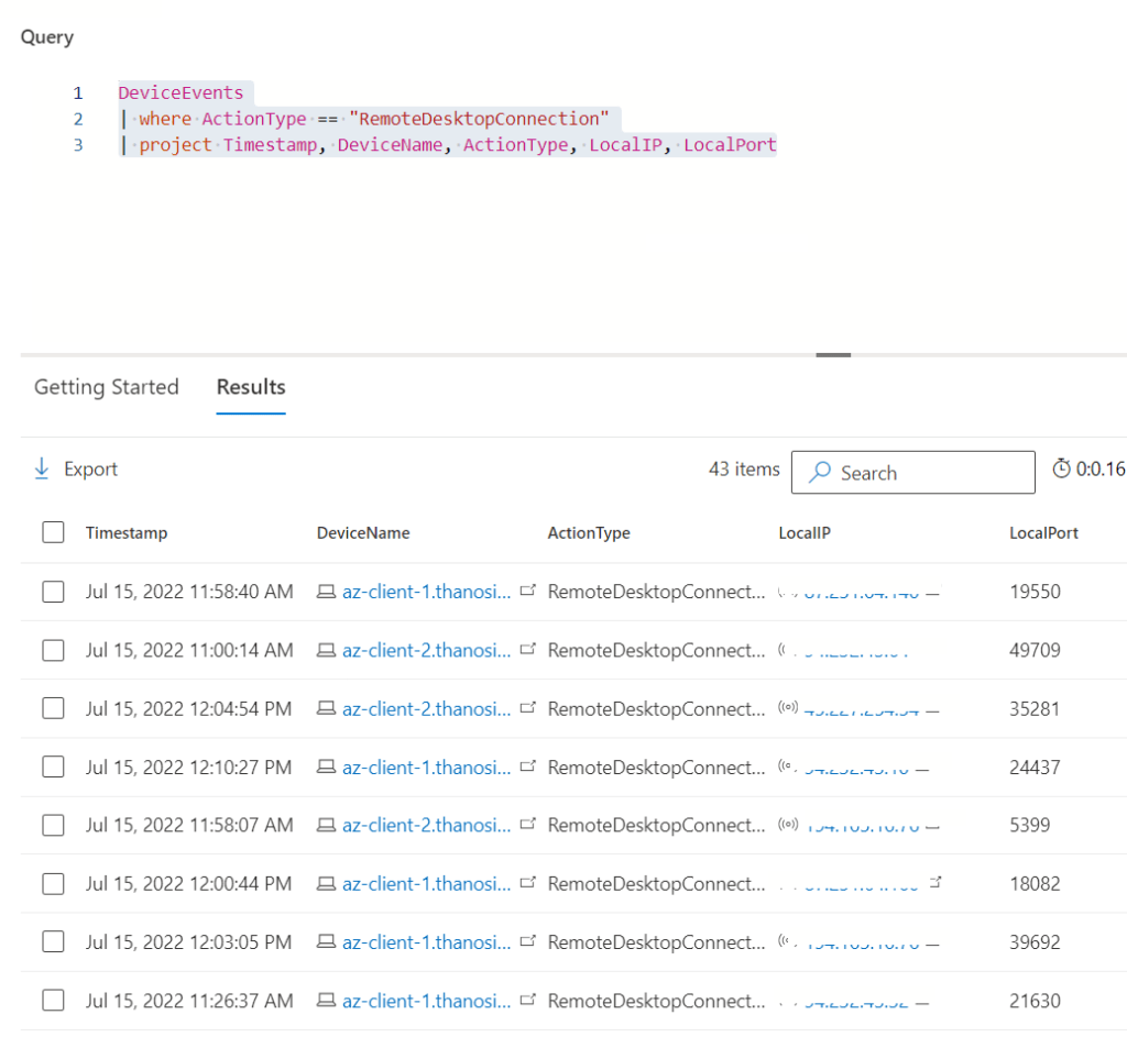 Out of the many function and query options, I’m looking for Remote Desktop attempts on my devices.