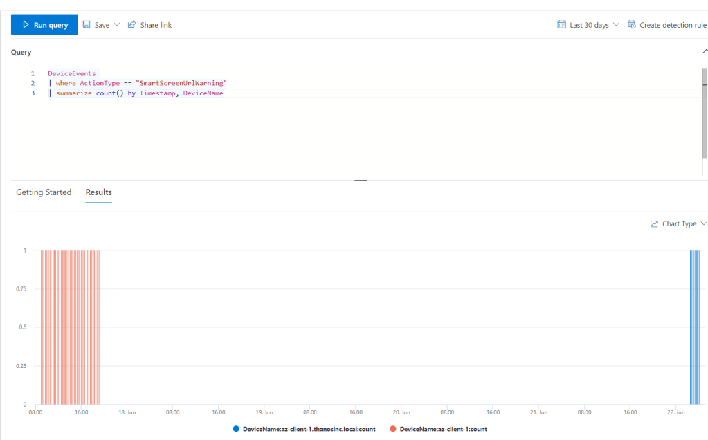 With those 2 prereqs completed, we can now move into the threat hunting canvas. As you may already know, KQL (Kusto Query Language) is what runs the show here which can be then rendered to graphical charts if needed and especially create detection rules to stay on top of your response and action side of things. The good thing is because this is built into the portal, you don’t have to connect an Azure Log Analytics Workspace, but if you need to stream the Defender data to Microsoft Sentinal, a log analytics workspace is required.