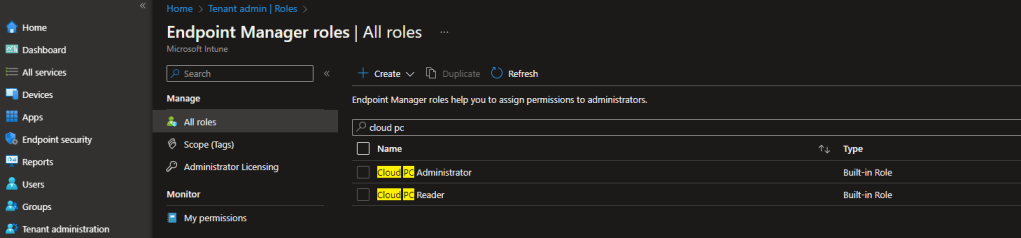 Cloud PC Built-in Roles