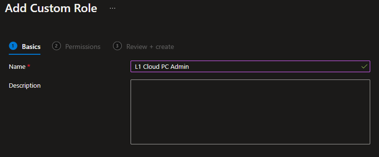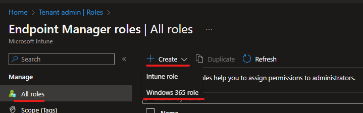 As you can see below in the same Roles section of the Intune portal, go to Create and select Windows 365 role