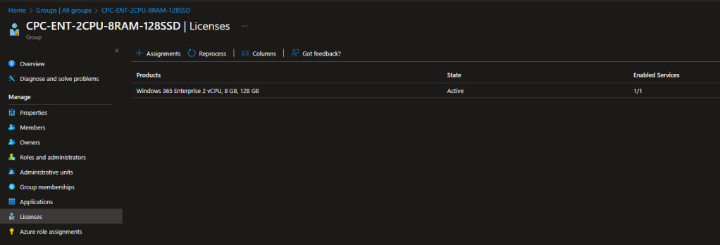 Example License = Windows 365 Enterprise 2 vCPU, 8 GB, 128 GB