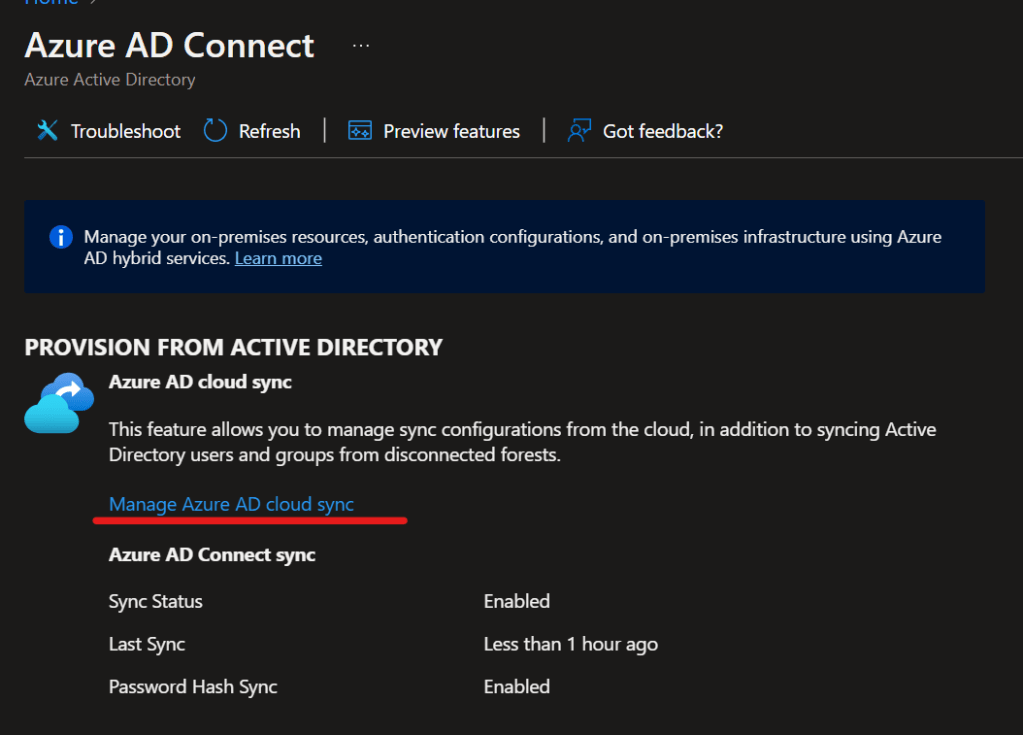 - Go to Entra Portal > Azure AD > Hybrid Management > Azure AD Connect