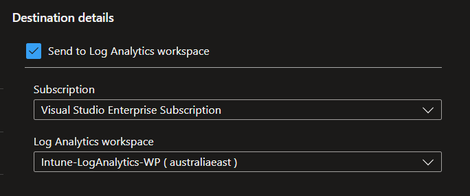 Select the Azure subscription and the Log Analytics Workspace for the Destination details