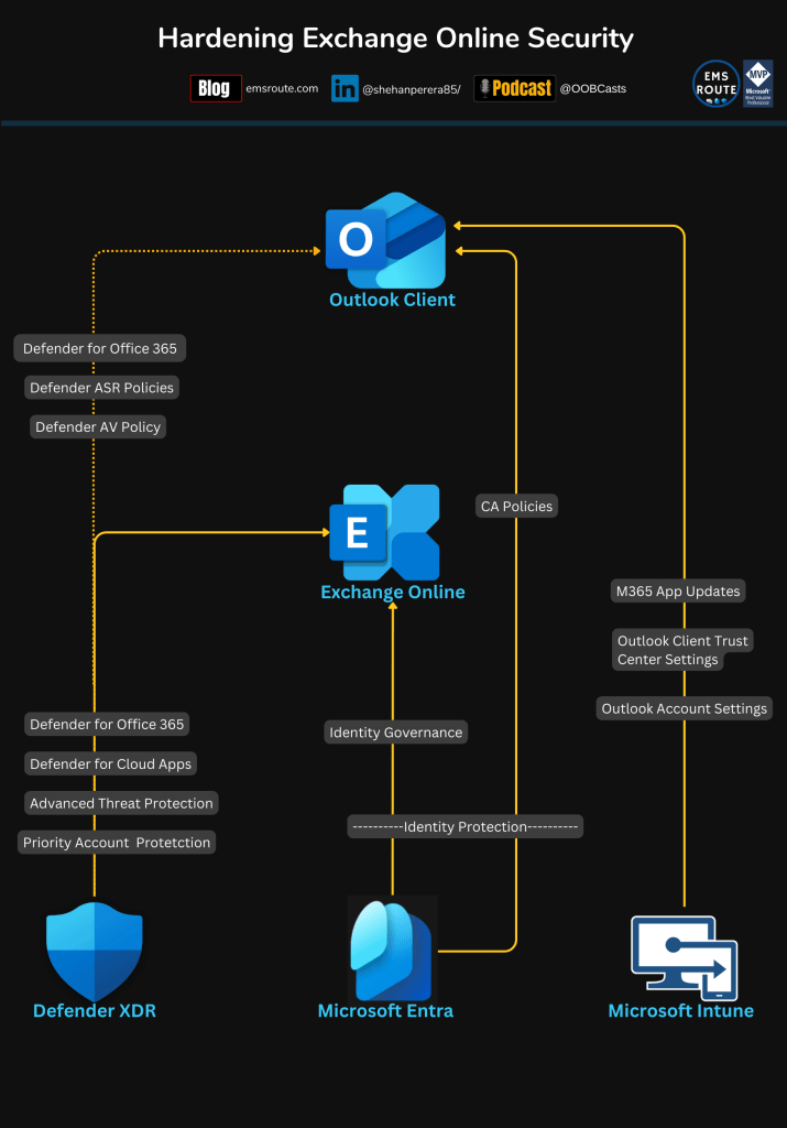 These are just a few of the plethora of security features that Entra, Defender, and Intune offer. I want to show the controls at a high level, so you’d better understand the features and what it does in protecting the Exchange Online.