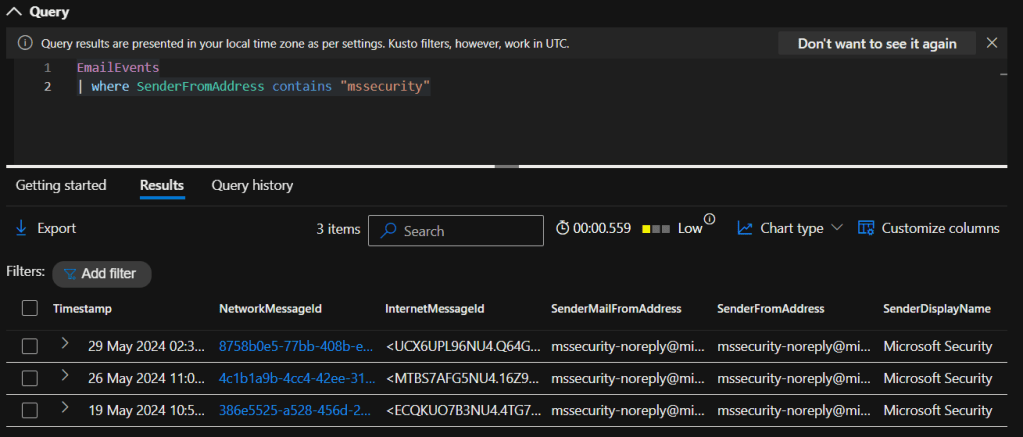 Without going into details, Advanced Threat Hunting can be done to investigate email related security issues. Check the below example and with some KQL knowledge you can store your pre-written queries to run whenever you need to hunt for threats.