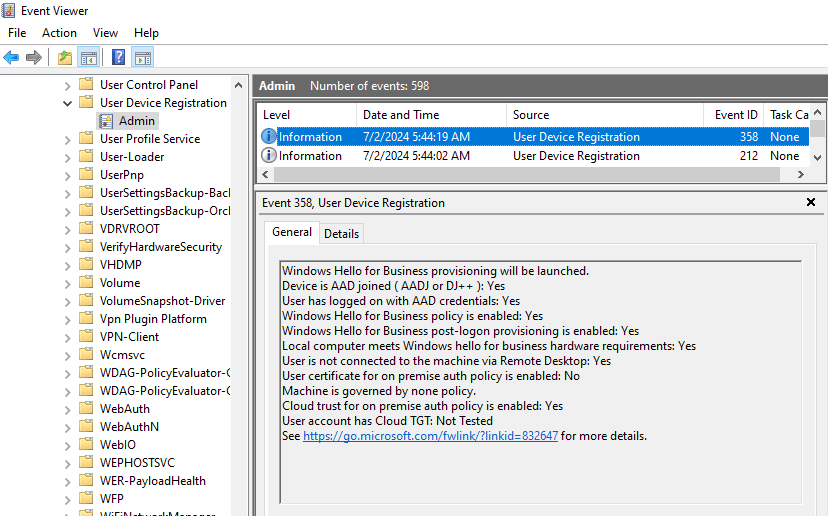 Now if you check the User Device Registration admin log under Applications and Services Logs > Microsoft > Windows in Event Viewer,