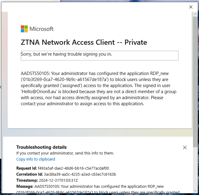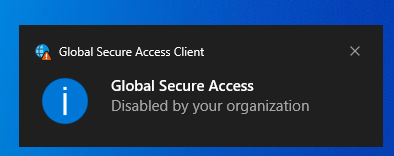 • If the users or the groups are not assigned to the Traffic Forwarding profile, the GSA client will not connect and will show the below error.