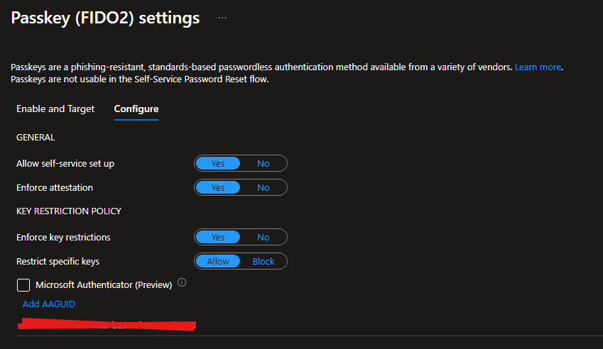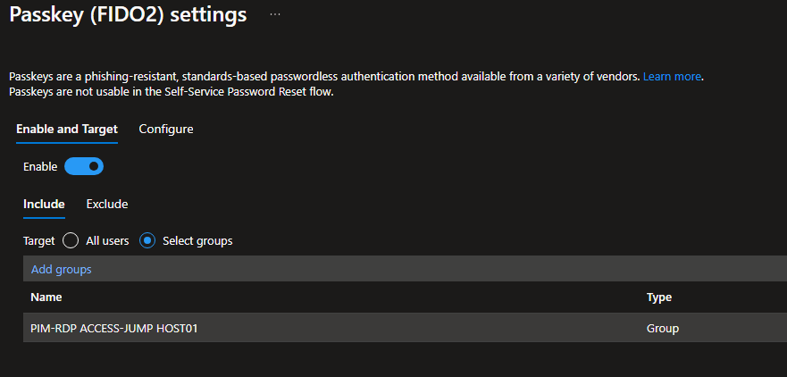 Go to Protetction > Authentication methods > Policies > Passkey (FIDO2) > Add the previously created group