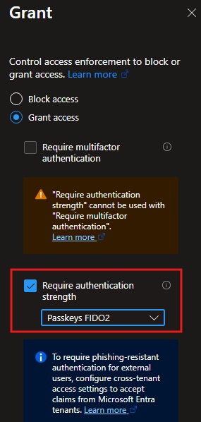Now in the Grant Section, select Require authentication strength and select Passkeys FIDO2