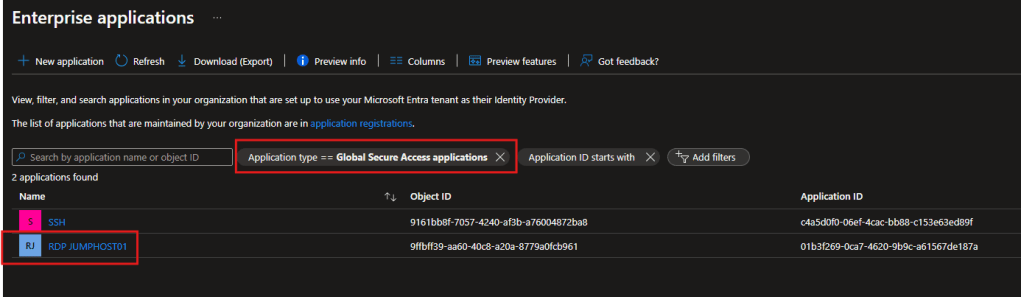 If you now go to the Enterprise applications section, the app will be visible. Note the Application type as Global Secure Access applications.