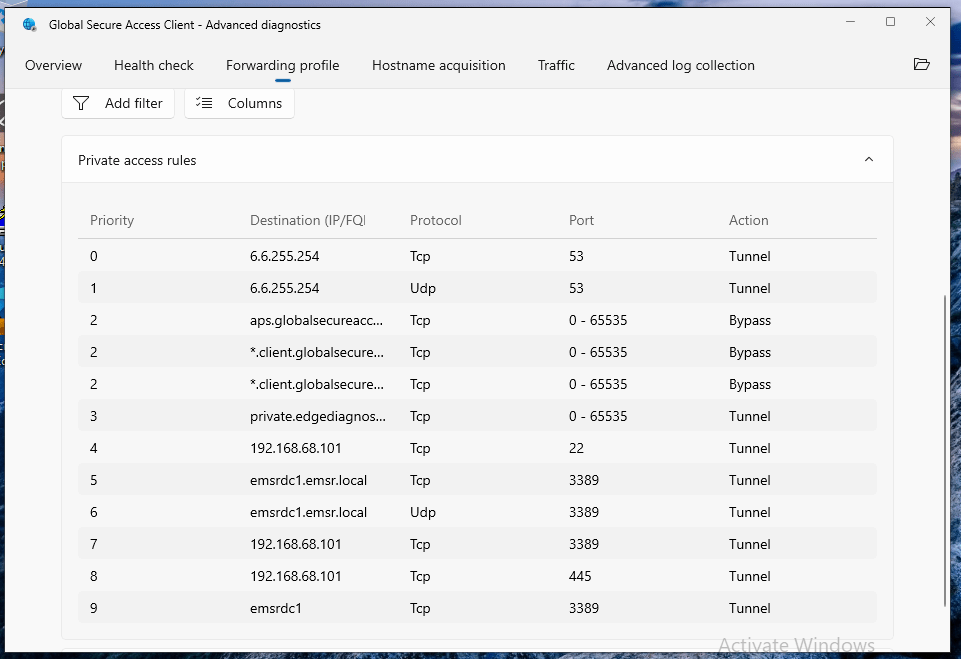 If you head to the client device > Go to Advanced Diagnostics > Forwarding profile > Private access rules, you will see the received network rules as below.