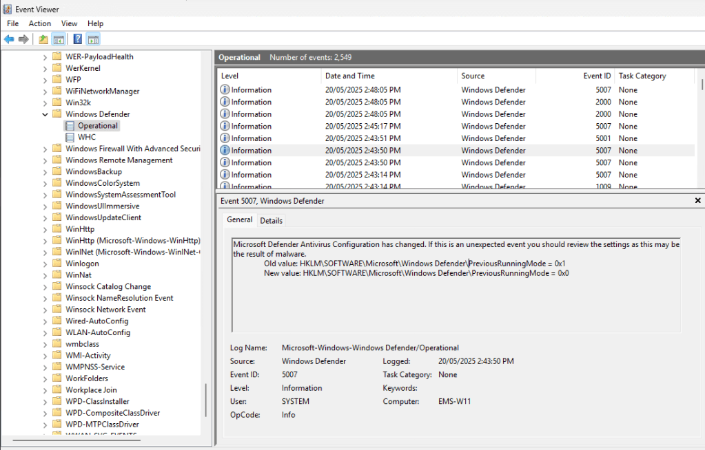 Logs: Microsoft-Windows-Windows Defender/Operational