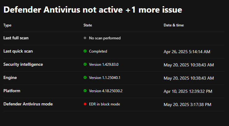 Ideally, if something like this happens, the above will not revert the situation and put Defender AV back in the Primary Mode and the Real-Time Protetction is no longer available and Defender will not be the Primary AV, and therefore ASR rules, AV policy and other Security policies will not be imposed on the device. However, EDR in Block mode will still work on the backend and send the alerts, but being vigilant, updated security software, and taking proactive measures to make sure you are aware of what’s going on in the endpoint matters.