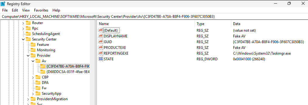 Location: HKLM\SOFTWARE\Microsoft\Security Center\Provider\Av