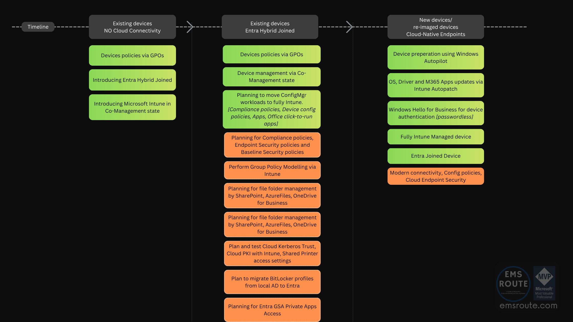 As the 2nd block in the diagram shows, that’s where you introduce many cloud capabilities into the end-user environment. Also, many organizations are surely in this state at the moment, where they have a strong device management process. But the fact of the matter is, it’s not cloud-native. Chances are, you have been in this state for a few years now. Maybe have forgotten about the Entra-Joined as that’s in the “long way to go” bucket, or “we are no way near making devices removed from our Local AD” argument.