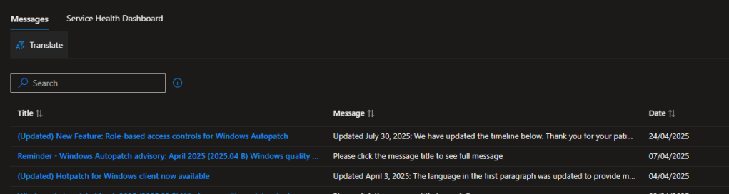 Staying on top of the service is important when you are patching devices using Autopatch. This section will show you any updates from Microsoft related to the service and the overall health of Autopatch service.