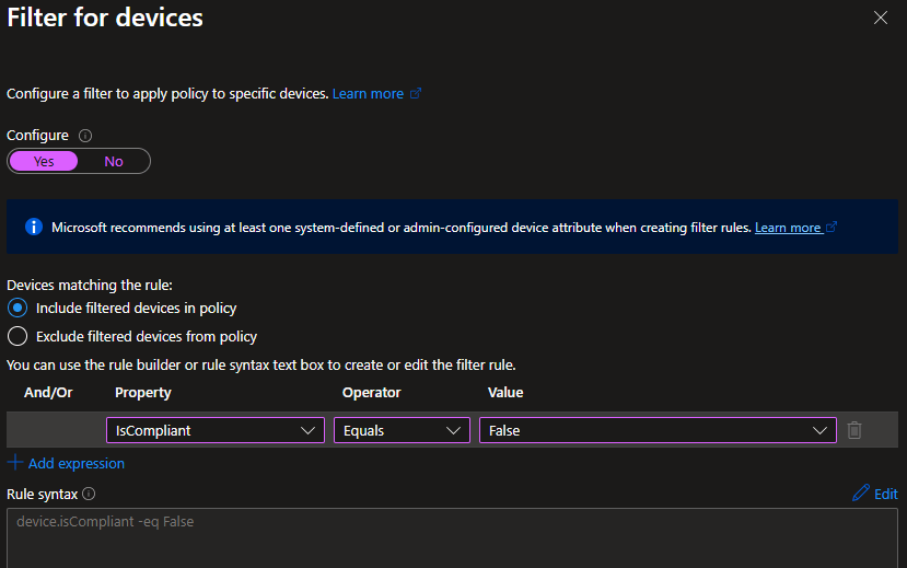 When creating the Conditional Access policy, you can use the above compliance signal to make sure you are addressing the correct set of devices by setting a Device Filter in your policy.,