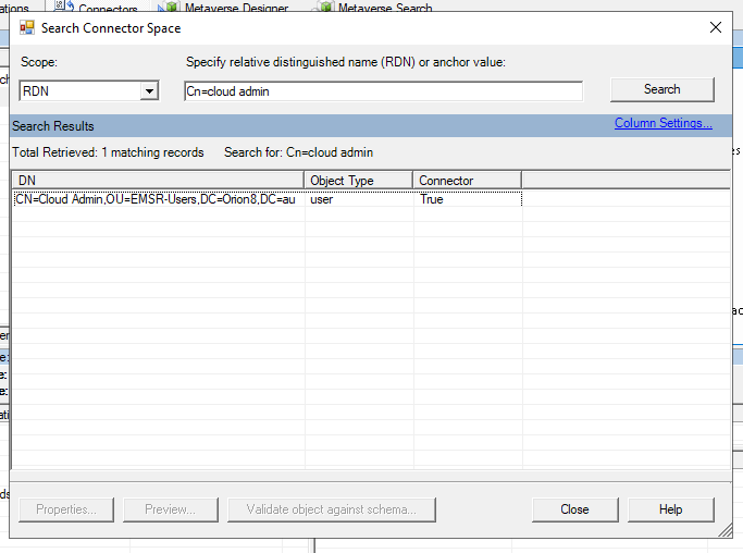 Double-click on the user account > Go to Lineage tab > Go to Metaverse Object Properties > Connectors > Double-click on the entry for the tenant connector with CN={random numbers}