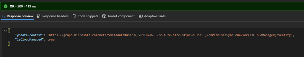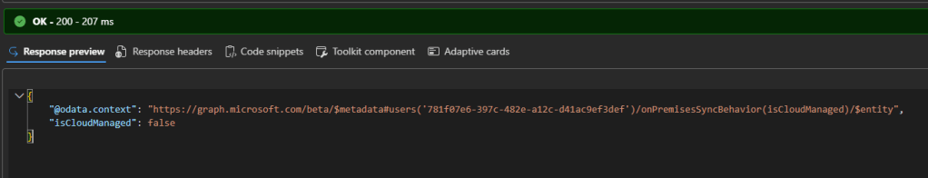 GET https://graph.microsoft.com/beta/users/<userID>/onPremisesSyncBehavior?$select=isCloudManaged