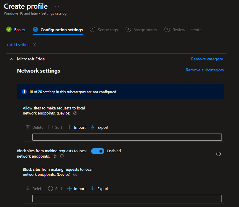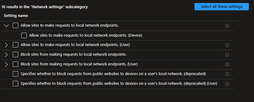 Use the Settings Catalog setting “Allow sites to make requests to local network endpoints” and “Block sites from making requests to local network endpoints” as needed and set the URLs.