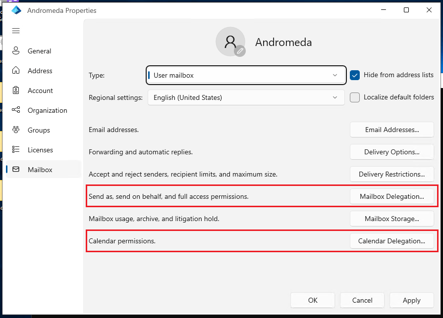 • Send As Permissions, Send on Behalf of permissions